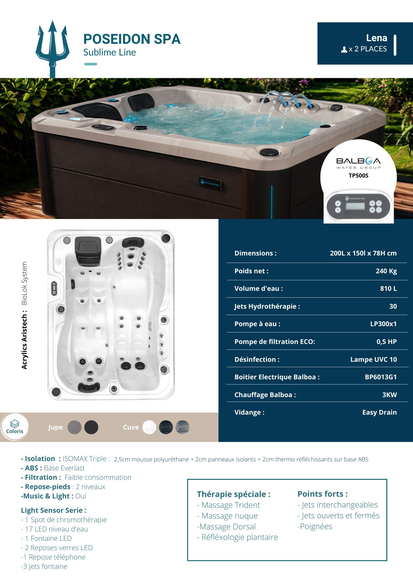 Profitant de dimensions 200 x 110 x 78 cm et de 2 places assises ou allongées, il dispose d’un volume d’eau de 800L, de 30 jets d’hydrothérapie et d’un ordinateur de bord Balboa TP 500s.