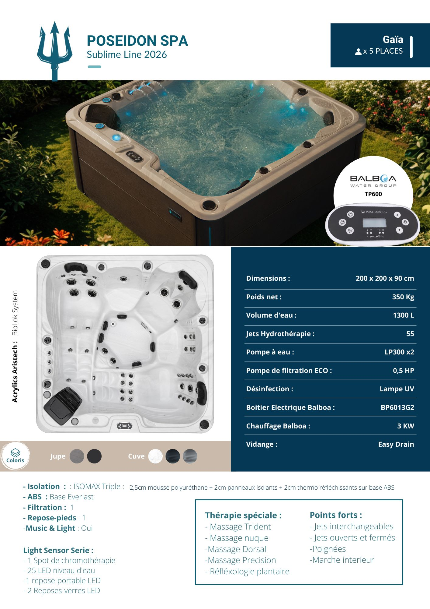 Le Spa Gaïa – Sublime Line est un spa 5 places convivial, composé de deux banquettes allongées, deux places assises et une place capitaine, offrant un parcours thérapeutique complet et varié, idéal pour toute la famille. Il se distingue par ses équipements premium, notamment la fontaine Triomphe à 3 jets, qui apporte une touche élégante et sensorielle, ainsi que ses angles lumineux au design plus contemporain, renforçant son esthétique moderne. Performant et raffiné, le Spa Gaïa est conçu pour vous offrir des moments de relaxation intenses et durables.